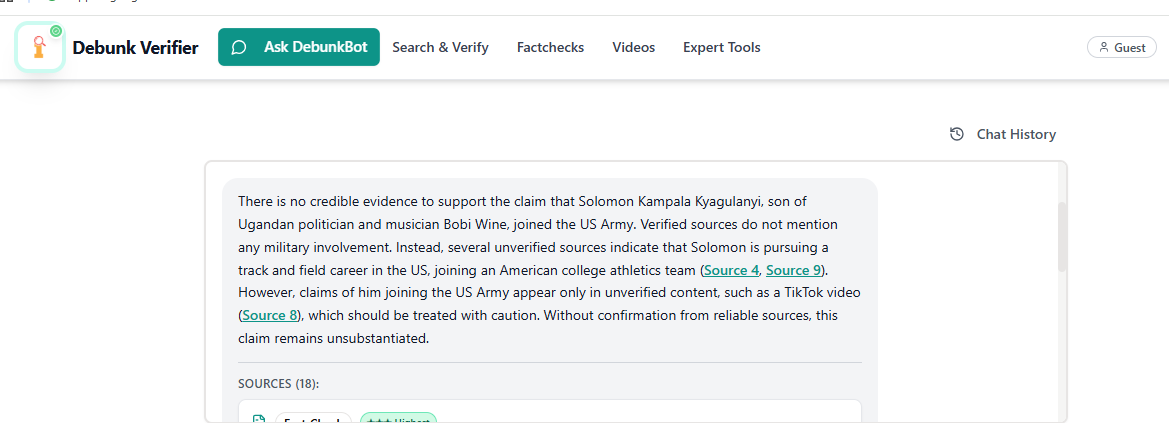 Using the Debunk Verifier, a fact-checking tool with AI features, we posed a question in the Ask Debunk Bot feature, “Did Solomon Kampala Kyagulanyi Join the US Army?” and the Bot’s results stated that there’s no credible evidence to support the claim that Solomon Kampala Kyagulanyi has joined the United States Army.