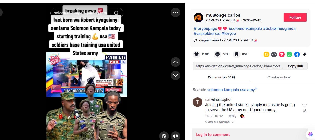 One of the posts, published on 12 October 2025 by TikTok user @muwonge.carlos, shows a photo of Solomon Kampala in what appears to be a U.S. Army uniform, followed by a separate video clip of him running.